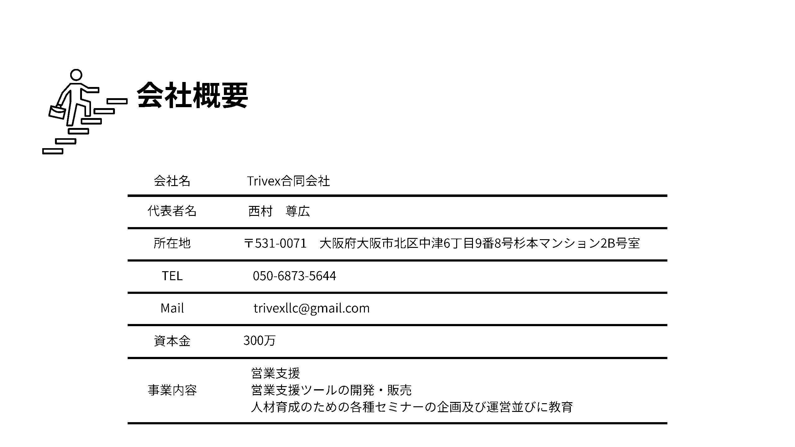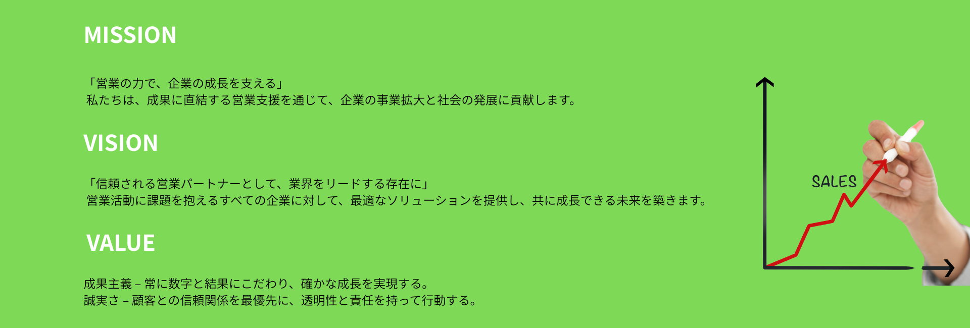 私たちは「営業を通じて企業の成長と社会の発展に貢献する」ことを理念としています。成果に直結する営業支援を提供し、お客様の事業価値を最大化することで、共に持続的な成長を目指します。常に誠実であり、信頼されるパートナーとして挑戦を続けます。